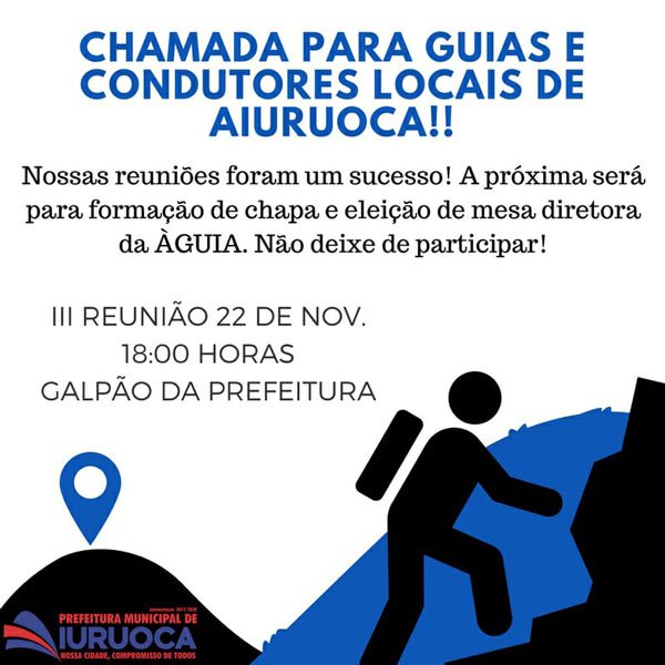 A Secretaria de Desenvolvimento Econômico, Social e Ambiental, convida os Guias e Condutores Locais de Aiuruoca para a terceira reunião de aproximação a ser realizada no dia 22 de novembro, quarta-feira, às 18:00 horas no galpão da Prefeitura (Rua Felipe Senador, n°1300, Campo Prático).