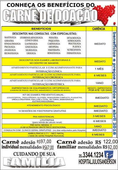 Para aqueles que desejam se tornar contribuintes o hospital está com uma promoção, não será cobrada a taxa de abertura para quem se cadastrar no final do ano. O carnê agora pode ser realizado também via whatsapp, através dos números: (35) 99734-6150 ou (35) 334431234.