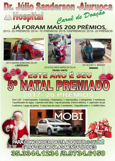 O Hospital Dr. Júlio Sanderson, de Aiuruoca, está realizando a 5ª edição do Natal Premiado com o sorteio de um carro zero e mais 19 prêmios. Esta é a maneira que a administração do hospital encontrou para agradecer aos colaboradores do carnê por mais um ano de parceria.