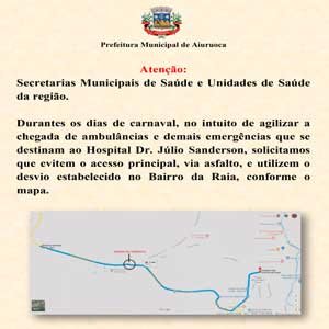 Os foliões devem entrar na cidade pelo desvio estabelecido pelo Bairro Raia para evitar a principal entrada da cidade, via asfalto, e deixar o acesso livre para possíveis casos de urgência e emergência do Hospital Dr. Júlio Sanderson.