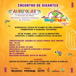 Ainda no sábado, o Bloco do Pijama, de São Lourenço, vai puxar a multidão em Aiuruoca. A concentração será às 21h na Quadra da Escola Maria José Ematne e a saída às 22h 40min. O bloco ainda conta com DJ Matth Senatore, Bateria, Bloco dus Tulio e a recepção será feita pelo Apito do Mestre.