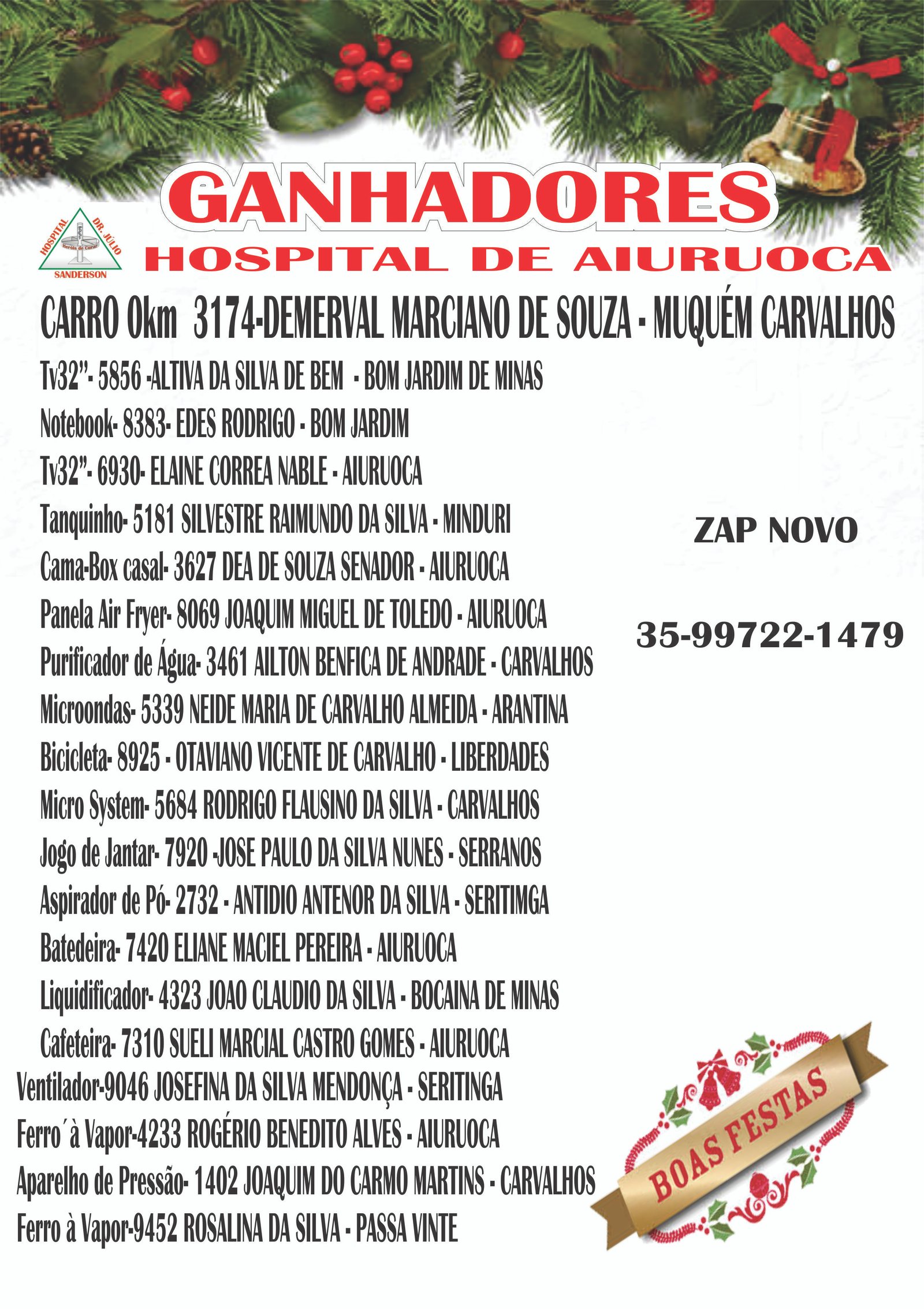 Um verdadeiro show de prêmios aconteceu no Hospital de Aiuruoca, em comemoração ao Natal. Com a ajuda dos Associados da Região a arrecadação de verba e prêmios foi um sucesso. Sendo o grande sorteado o Sr. Dermeval Marciano de Souza, do distrito de Muquem, Carvalhos, que levou o prêmio mais cobiçado da noite, um carro 0km.