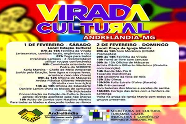 A Prefeitura de Andrelândia, por meio da Secretaria Municipal de Cultura e Turismo, irá realizar nos dias 01 e 02 de fevereiro a Virada Cultural 2020.