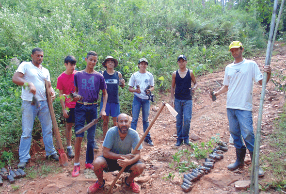 Alunos das escolas Alfredo Catão e Nossa Senhora do Montserrat, com o secretário de Turismo e Meio Ambiente, Junier Ferreira do Amaral Junior, e o engenheiro agrônomo Marcos, realizando os plantios