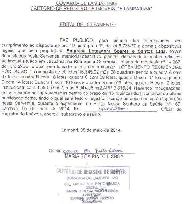 legais, que pela proprietária Empresa Loteadora Soares e Santos Ltda, foram depositados nesta Serventia memorial descritivo, plantas, demais documentos relativos ao imóvel situado em Jesuânia, na Rua Santa Generosa "LOTEAMENTO RESIDENCIAL PÔR DO SOL", composto de 90 lotes (16.345.92 m2); 08 quadra A com 07 lotes; quadra B com 18 lotes; quadra C com 09 lotes; quadra D com 14 lotes; quadra institucional com 3.590.53ms2; ruas 6.944.98ms2:APP 3.816,84. Havendo impugnações, estas deverão ser apresentadas dentro do prazo de 15(quinze) dias contados da última publicação deste findo o qual será feito o registro, ficando os documentos a disposição nesta Serventia, durante o expediente, na Praça Nossa Senhora da Saúde, nº 167. Lambari, 05 de maio de 2014. Eu