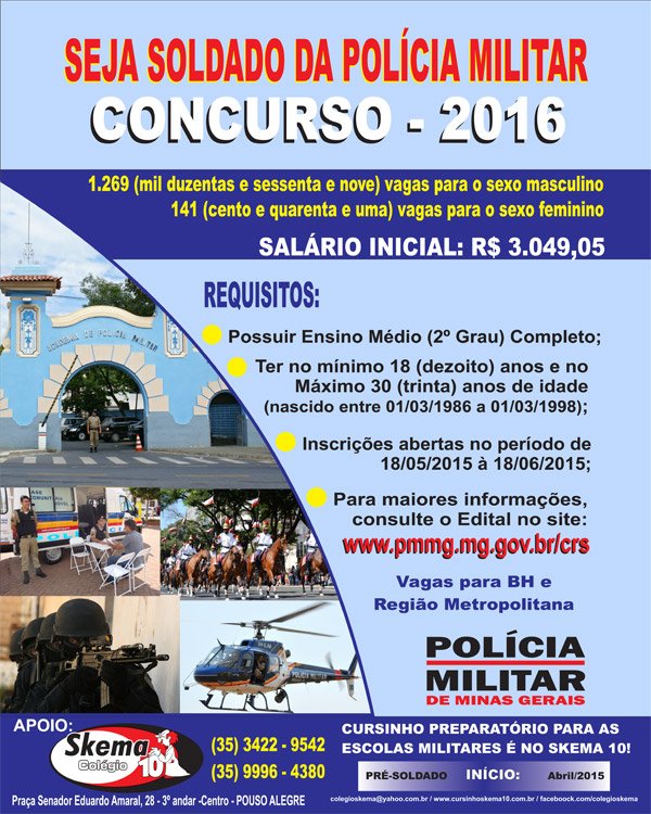 Já está disponível o edital do concurso público para a admissão ao Curso de Formação de Soldados da Polícia Militar de Minas Gerais, para o ano de 2016.