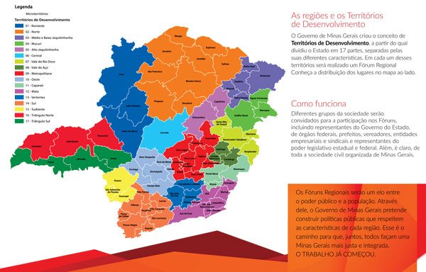 O Governo de Minas Gerais criou o conceito de Território de Desenvolvimento, que divide o Estado em 17 partes, separadas por suas diferentes características. Em cada um desses Territórios foi instalado um Fórum Regional.