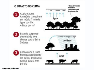 “Na Amazônia as árvores são antigas e têm raízes que buscam água a mais de 20 metros de profundidade, no lençol freático. A floresta está ligada a um oceano de água doce embaixo dela. Quando cai a chuva a água se infiltra e alimenta esses aquíferos”, esclarece.