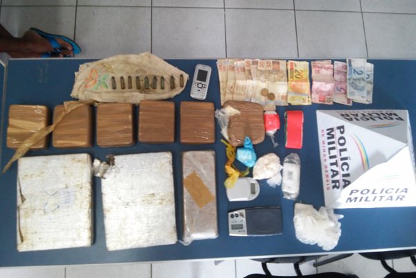 Os militares realizaram buscas na casa e apreenderam R$1.100,00 em dinheiro e com o autor foi apreendido um aparelho celular. Já em um terreno baldio foi localizada em meio a vegetação uma mochila contendo sete tabletes de cocaína, pesando aproximadamente 4kg; três porções menores da mesma substância, pesando cerca de 230g; dois tabletes de maconha prensada, pesando aproximadamente 3kg; duas balanças de precisão; um rolo de fita adesiva; diversas embalagens plásticas; um papel contendo anotações. Foi localizado também próximo ao local, escondido sob entulho, 10 munições calibre 38 intactas e envoltas em um pano.