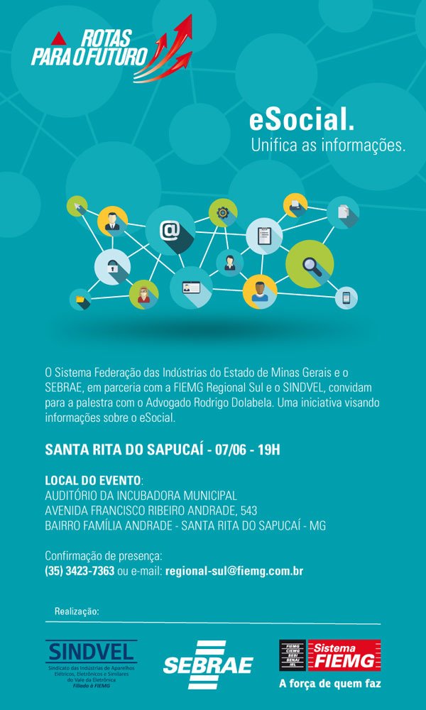 As indústrias mineiras estão adequando-se ao novo Sistema eSocial, implementado pelo governo como ferramenta de controle do cumprimento das obrigações trabalhistas e previdenciárias. O tema estará em debate em Santa Rita do Sapucaí, Sul de Minas, no dia 07 de junho, no Rotas para o Futuro. A palestra ocorre no Auditório da Incubadora Municipal, no Bairro Família Andrade, às 19 horas. Em sua 6ª edição, o projeto do Sistema Fiemg, em parceria com o Sebrae Minas, irá percorrer 12 cidades do estado. O Rotas para o Futuro aborda temas relevantes para o fortalecimento da indústria mineira em municípios que integram as Regionais Fiemg.