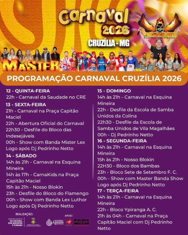 O carnaval de Cruzília inicia na quinta-feira, 12 de fevereiro, com o Carnaval da Saudade no CRE às 22h. Na sexta-feira, 13 de fevereiro, a festa acontece na Praça Capitão Maciel a partir das 21h, com abertura oficial às 22h, desfile do Bloco das Indesejáveis às 22h30 e show da Banda Mister Lex à meia-noite.