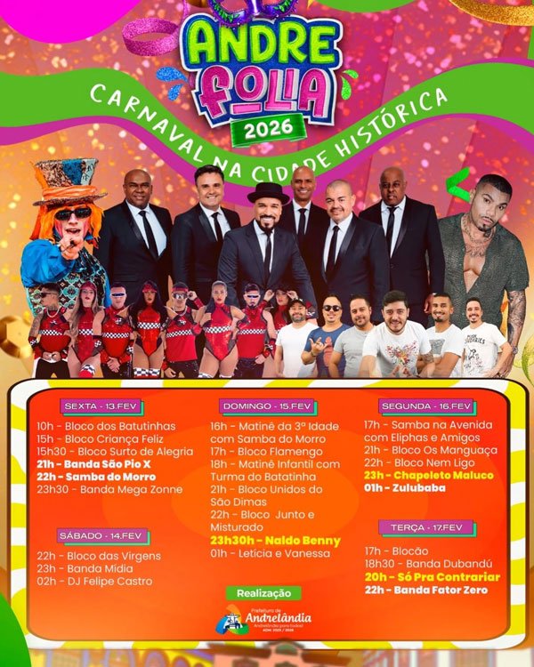 O Carnaval de Andrelândia já tem data e ritmo definidos. O AndreFolia 2026 promete uma mistura vibrante de blocos tradicionais, matinês para todas as idades e grandes shows nacionais, consolidando-se como um dos destinos mais procurados da região