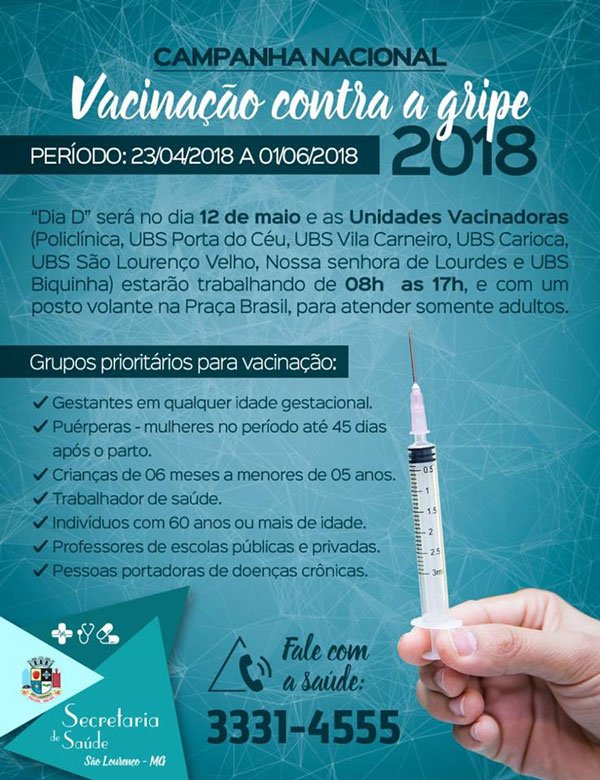Todos os municípios do país farão, neste sábado, 12, o dia D da campanha de vacinação contra a gripe. O objetivo da ação é aumentar a cobertura vacinal dos municípios. Iniciada em 23 de abril e com previsão de término em 1º de junho, em São Lourenço, a cobertura vacinal está em 35,06% e a meta até o final da campanha é que 90% da população alvo seja vacinada.