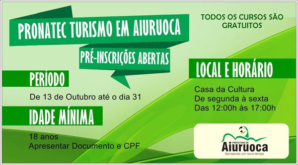 No dia 05 de agosto foi assinado em Brasília – DF - pela Secretária Municipal da Sedesa Valquíria Paula da Silva, o Termo de Adesão de Cursos do Pronatec que serão ofertados em Aiuruoca. O município foi contemplado juntamente com outras 69 cidades do Brasil. “A Prefeitura de Aiuruoca vem trabalhando de maneira intensa com o intuito de reforçar o turismo local, com a reativação do Comtur (Conselho Municipal de Turismo), elaboração do Plano Municipal de Turismo, projeto de sinalização urbana e rural, regularização e credenciamento de pousadas e estabelecimentos comerciais voltados para o turismo, parceria com a Actua viabilizando o Centro de Informações Turísticas e buscando sempre parcerias que possam beneficiar nossa população. É um orgulho o nome de Aiuruoca está entre as 70 cidades contempladas em todo o Brasil, pelo Ministério do Turismo e Pronatec” – destacou a Secretária Municipal da Sedesa: Valquíria Paula da Silva.