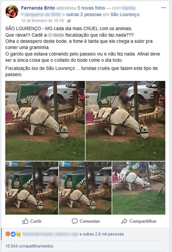 O caso ganhou destaque na cidade durante a semana. Na publicação, uma turista de Rezende (RJ) mostrava um bode que puxava uma charrete se ajoelhando para comer grama. Foram mais de 17 mil compartilhamentos e centenas de comentários de pessoas que são contra o uso de animais para este tipo de trabalho.