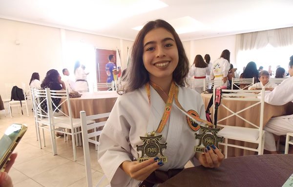 A karateca de São Lourenço Nicole Maciel Cadeiras, de 14 Anos, faixa Marrom, conquistou o Título de Campeã Mineira de Karatê da FMKI 2017, nas modalidades KATA e KUMITE, na categoria infanto Juvenil de faixa Verde, Roxa, Marrom e Preta, de 13 a 14 Anos.