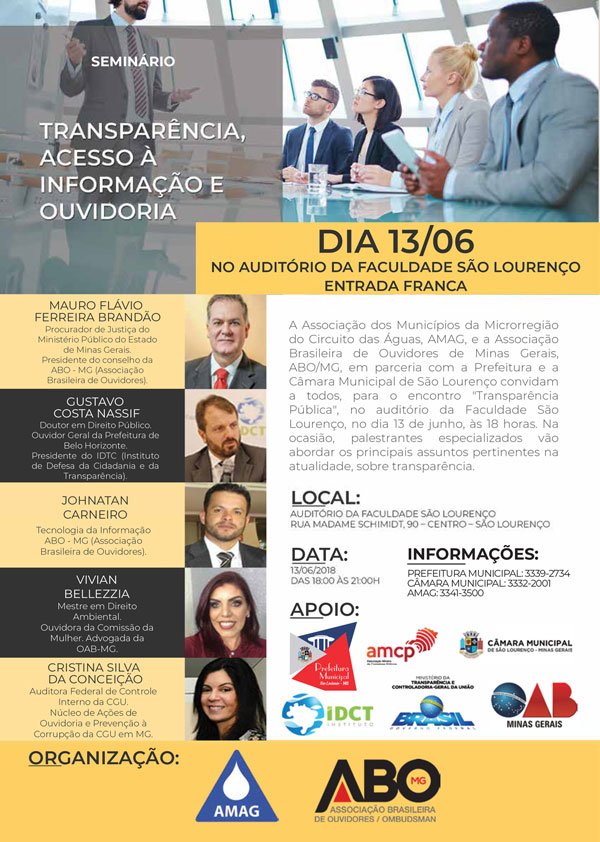 A Associação Brasileira de Ouvidores - Seção Minas Gerais - ABO/MG em parceria com a Associação Municipal da Microrregião do Circuito das Águas – AMAG e a realizarão com o apoio da Prefeitura Municipal de São Lourenço da Câmara Municipal de São Lourenço, do Instituto de Defesa da Cidadania e Transparência - IDCT, Ministério da Transparência e Controladoria da União em Minas Gerais - CGU, da Ordem dos Advogados do Brasil - Seção Minas Gerais - OAB/MG.
